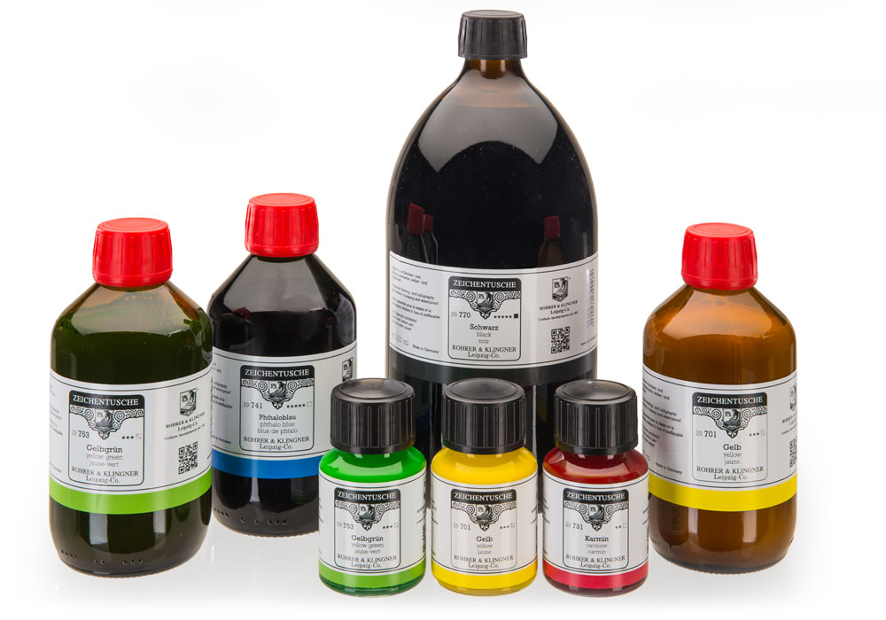 Rohrers pigmentierte Zeichentusche wird in vielen klassischen Farbtönen aus modernen Ausgangsstoffen – Acrylharz und feinstverteilten Farbmitteln – auf Wasserbasis hergestellt.