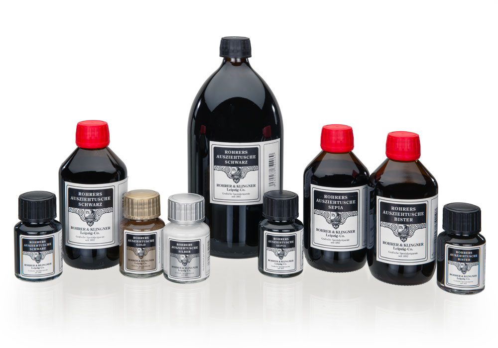 Die Ausziehtuschen Sepia, an den organischen Sepia-Ton des Tintenfisch-Sekretes angepasst, und Bister sind als transparente Tuschen konzipiert. Sie sind weitgehend lichtbeständig.